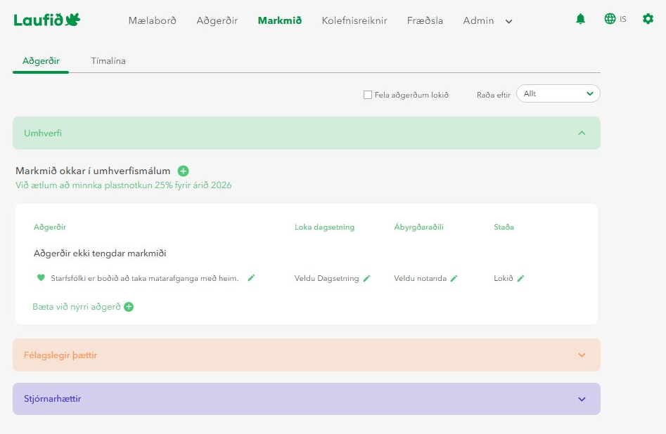 Með markmiðakerfi Laufsins geta stjórnendur sett sér fjölbreytt markmið eins og að draga úr matarsóun, minnka plastnotkun, hækka flokkunarhlutfall eða bæta nýtingu orku og auðlinda.